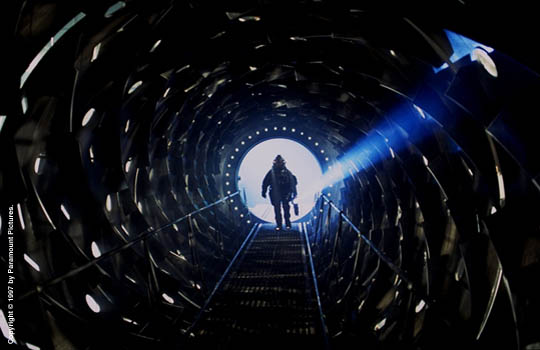 Only when they are in deep space,however, does Weir divulge the secrets of the Event Horizon. Weir reveals that everything they have ever heard about the fate of the ship is a lie,but they are also completely unprepared for the truth. He explains that the Event Horizon was the first spaceship designed for faster-than-light travel, a concept which, they all thought, was physically and technologically impossible. The ship disappeared without a trace when the gravity drive, her revolutionary engineering process, had been engaged.Uneasiness becomes anxiety when Weir plays the brief, fragmentary recording that is the only clue to the ship's fate -- a recording of terrifying, inhuman shrieks and wails.
